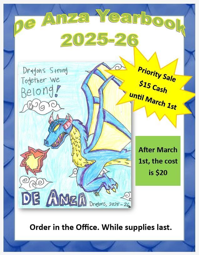 DE ANZA YEARBOOK SALE Pre order in the school office during school hours. Attached Files De Anza Yearbook - 2025-26 - flyer - as of 15jan2026.pdf